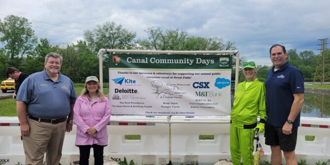 Over 60 volunteers worked together to girdle English ivy on 12 trees, paint 15 structures, remove 450 pounds of invasive vegetation, spread 19 cubic yards of mulch, and collect 375 pounds of trash. We were joined in Williamsport by Maryland State Senator Mike McKay and Washington County Chamber of Commerce President & CEO Paul Frey, who shared their appreciation with volunteers and their commitment to the protection of the park. Thank you to everyone who helped us make the park shine! As summer begins, we can’t wait to see more of our canal community out enjoying the park and experiencing the small town charm of Williamsport. We are grateful for our passionate community of supporters and volunteers — people like you — who help ensure the park and its resources are protected for today and preserved for the future.