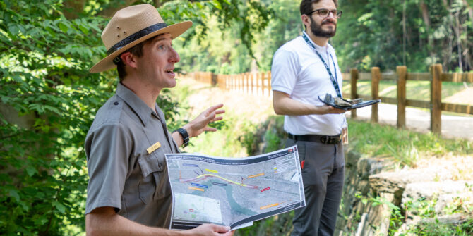 July 11, 2025, marked the celebration of the completion of the Log Wall, a historic drylaid stone wall, stabilization near the Carderock Recreation Area. This major $11.4M infrastructure project was made possible through the Great American Outdoors Act (GAOA) Legacy Restoration Fund. The stabilization focused on an approximately 1,015 linear foot long historic drylaid stone wall, which varies in height up to 35 feet tall. The wall was originally constructed between 1828 and 1831 and is often referred to as the “Log Wall,” as found in an 1890 Engineer’s Report.