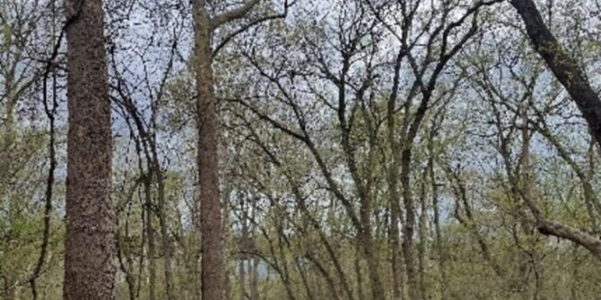 Blooming spicebush (Lindera benzoin) underneath trees beginning to leaf out.