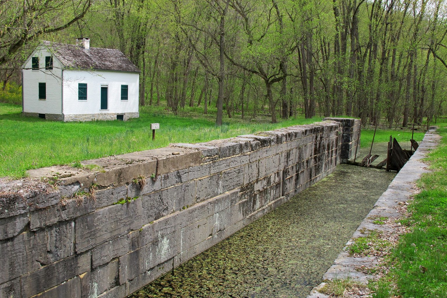 Located just upstream from the Canal’s midpoint, Lock 43 was constructed of blue-gray limestone. A white-washed brick lockhouse is still standing near the site.