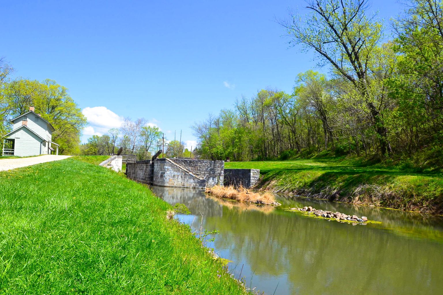 The gray and white limestone Lock 44 is located adjacent to downtown Williamsport, with an earthen dyke that leads over to Main Street.