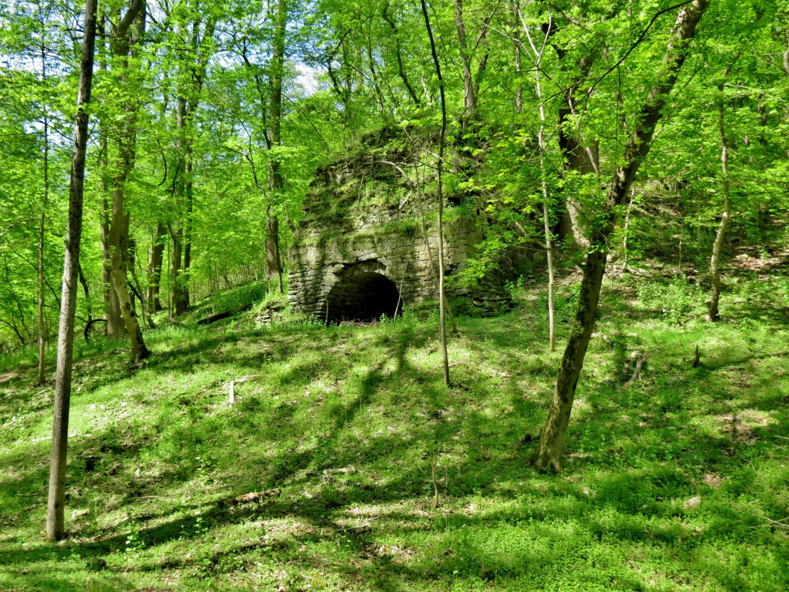 At this point along the Canal, you can observe brick-lined arches in a concrete facing. These are the remains of several limestone kilns that were used to create fertilizer, plaster and cement during the 19th century. Learn more.