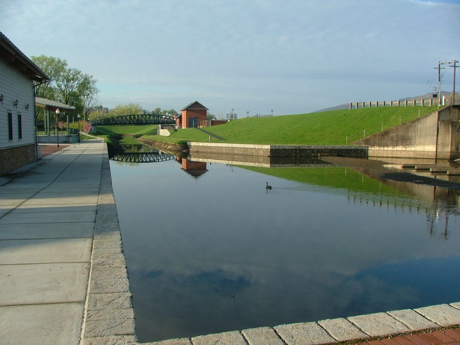 Near downtown Cumberland, the Canal divided into two elongated turning basins for boats: Main Basin and the broader Shriver Basin. Shriver Basin angled inland from the dividing spot and Main Basin continued along the river. Learn more.
