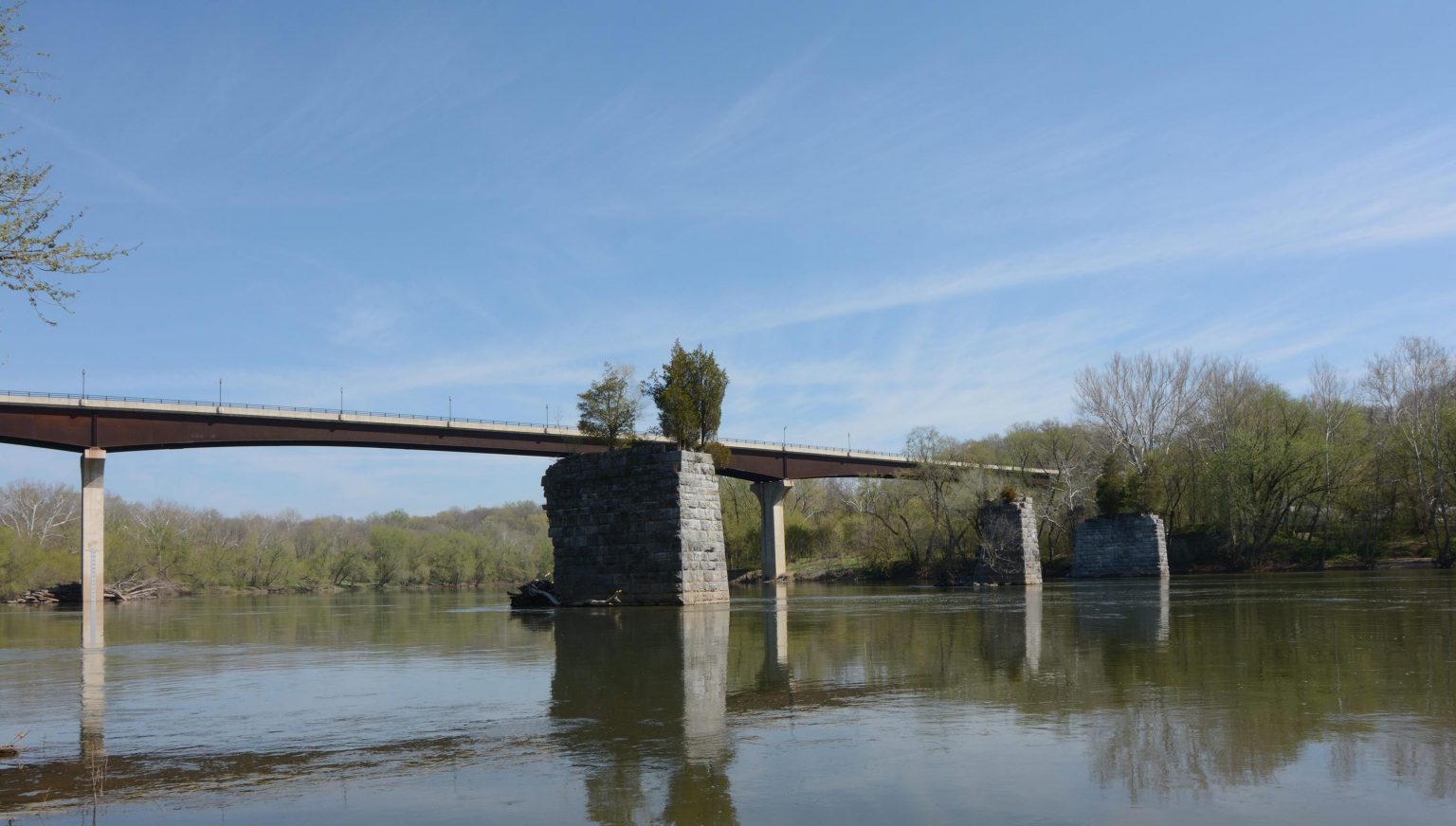 In the late 1840s, citizens chartered the Virginia and Maryland Bridge Company, which posed a threat to the ferry. Ferry service was discontinued in 1850 and the company built a covered wooden bridge. Potomac Bridge got travelers across the river, though it was destroyed in 1861, 1889, and 1936 by fire, flood, and flood – respectively. In 1939 the bridge was rebuilt again and named after the innovative inventor of the steamboat, James Rumsey, and now carries Route 34 overhead.