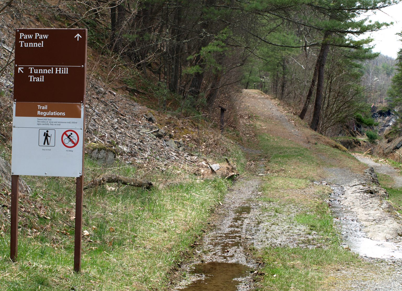 As an “overland” alternative to walking a half mile through the Paw Paw Tunnel, the Tunnel Hill Trail offers a walk through history and outstanding views of the Potomac River and tunnel gorge.