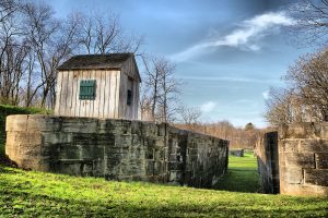 The only Watch House left standing on the Canal is on the upstream berm side at the end of Lock 50. This house allowed a safe-haven from weather for lock keepers to see oncoming boats, as it was closer to the locks and offered better visibility than the lockhouse did. Learn more.